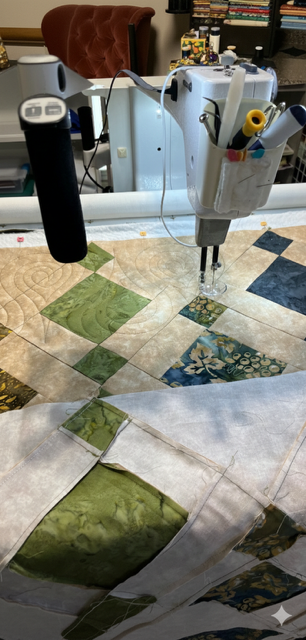 I use a Handi Quilter to do my long arm quilting. I have a 12 foot frame therefore, I can accomodate most size quilts ranging from Baby to King size.